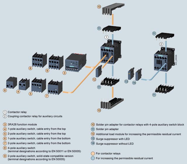 Các phần tử RC, biến thể, điốt hoặc cụm diode (kết hợp giữa một diode và một diode Zener) có thể được cắm vào tất cả các rơle công tắc tơ 3RH2 từ phía trước để giảm độ đột ngột mở trong cuộn dây. Hướng của trình cắm được xác định bởi một thiết bị mã hóa.